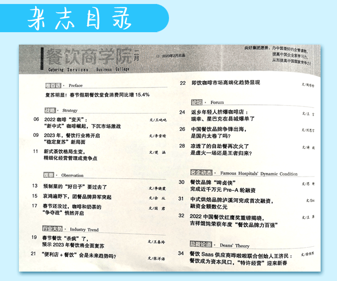 杂志概要:《餐饮商学院》共好商学院系列杂志以清新平实的风格及时报道各行业最新的行业资讯,管理理念和实践,揭示企业在经营管理中成功或失败的策略