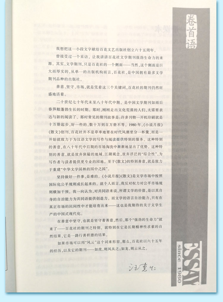 《散文》呈现了一种罕见的沉思的品质和悲悯情怀。薪火相传,《散文》在中国是本老资格的文学期刊了。主持期刊的编辑换了一批又一批,《散文》个性、气质却有着它的一贯性。谁主持《散文》,谁就背负着一分文化重担,谁就只能苦心孤诣。以“表达你的发现”为理念的《散文》,是中国创办最早、发行量最大、影响最广的专业散文期刊,三十余年来以其“格高、境阔、文洁、意新”的格调品位和“敬重名家、扶掖新人”的编辑理念,对中国的文学创作、批评、出版领域,乃至文化和语文教育领域,产生了极为深远的影响。